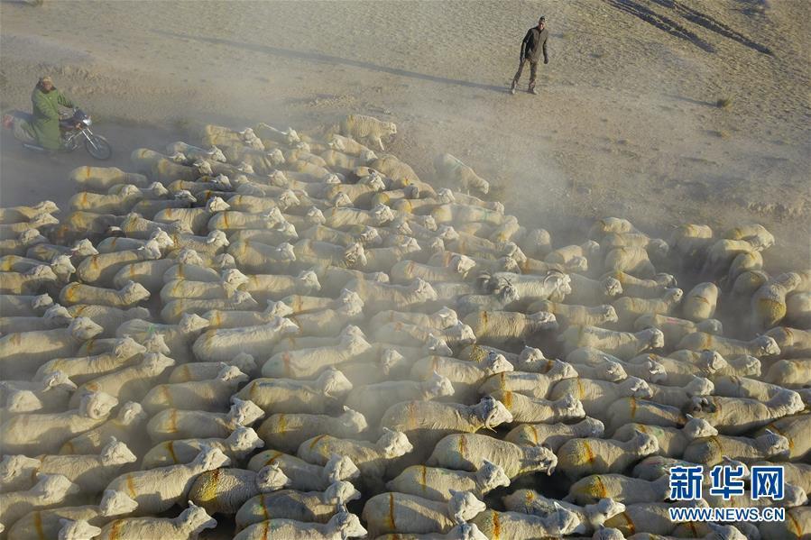 这是10月15日在肃南裕固族自治县拍摄的异地借牧途中的羊群(无人机照片)。新华社记者 范培珅 摄