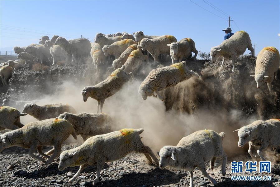 这是10月15日在肃南裕固族自治县拍摄的异地借牧途中的羊群。新华社记者 范培珅 摄