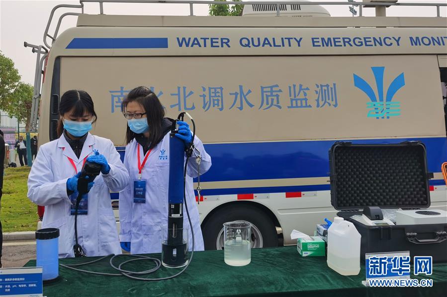 10月16日,在郑州举行的南水北调中线工程2020年度开放日活动现场,工作人员在检测水样(手机拍摄)。 新华社记者 刘诗平 摄