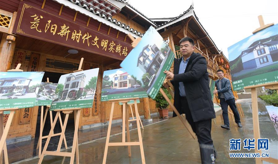 10月20日,在贵州省铜仁市玉屏侗族自治县皂角坪街道瓮阳村,村民夏政华(前)和帮扶干部一起摆放农村规范建房的设计效果图,供村民选择。 新华社记者杨楹摄