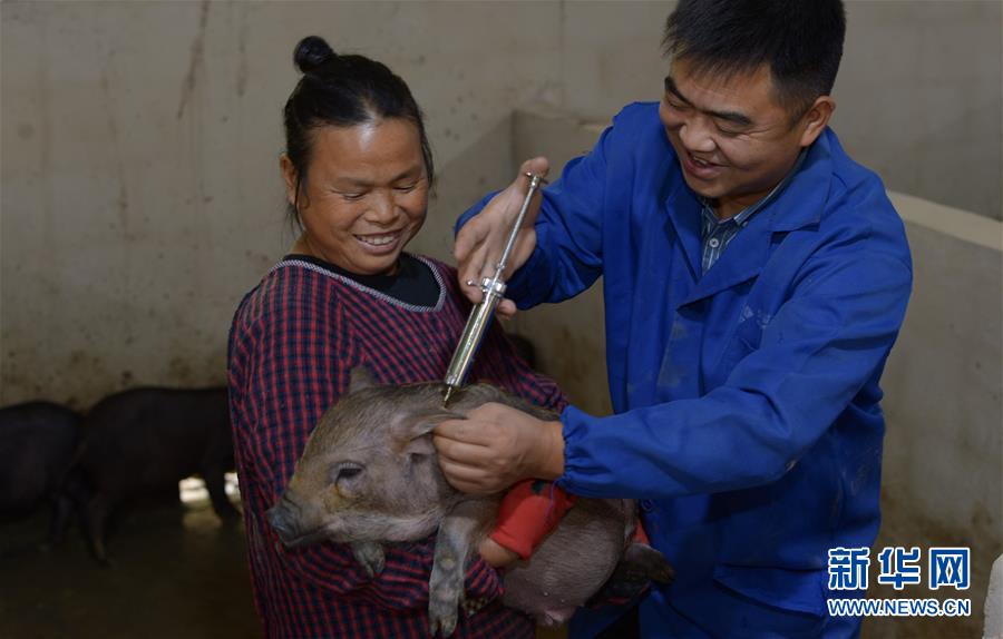 10月20日,在贵州省铜仁市玉屏侗族自治县皂角坪街道瓮阳村香猪养殖场,村民夏政华(右)和饲养员在给香猪幼仔打疫苗。 新华社记者杨楹摄