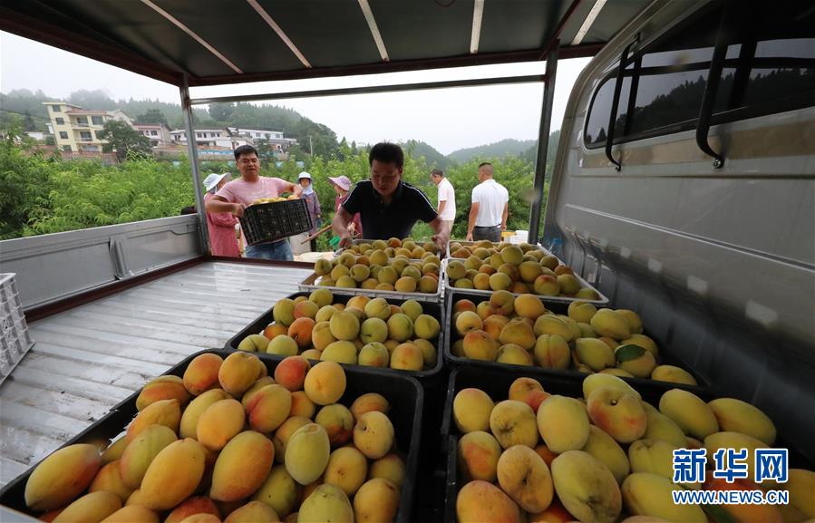 村民们在贵州省铜仁市玉屏侗族自治县皂角坪街道瓮阳村黄桃种植基地搬运黄桃(7月28日拍摄)。 新华社发(胡攀学 摄)