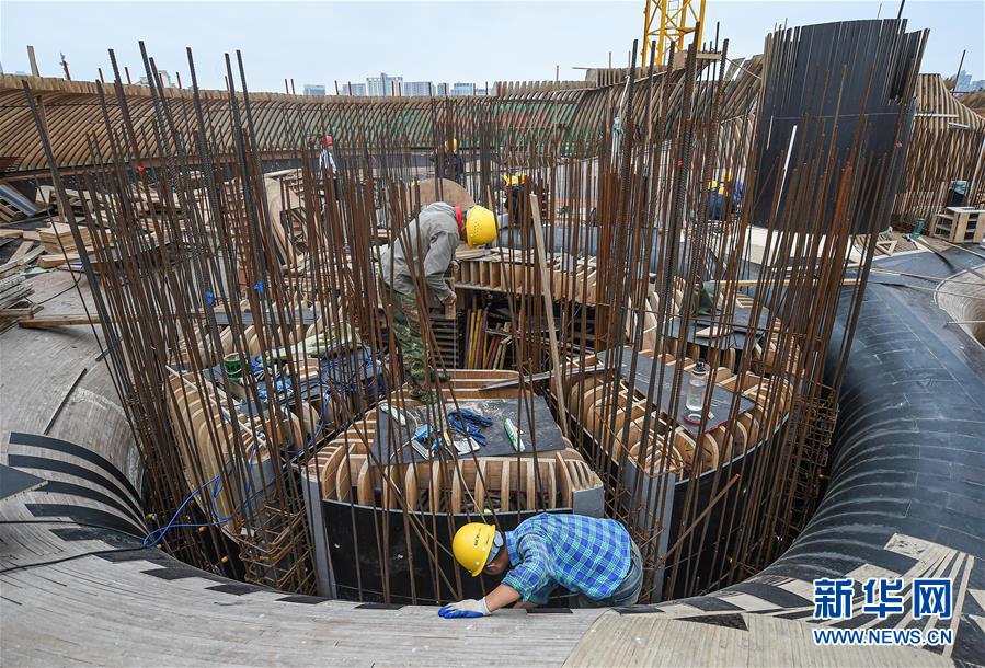 10月20日,工人在海口湾云洞图书馆项目工地施工。 近日,在位于海口市海口湾的云洞图书馆项目工地,工人们加紧施工。目前,该项目已进入地上主体结构施工阶段。项目建成后,云洞图书馆将成为海口湾标志性艺术建筑,并为市民、游客提供一处阅读和休憩的场所。 新华社记者 蒲晓旭 摄