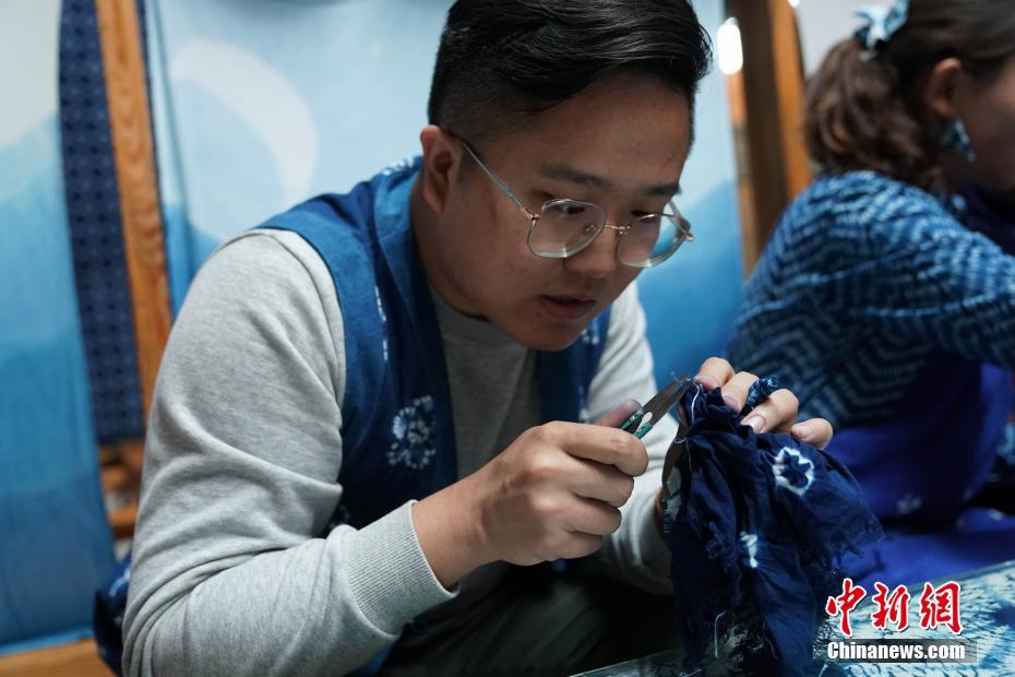 10月24日,“同饮一江水、共话澜湄情”2020澜湄万里行中外媒体采访团来到云南省大理市。在喜洲古镇周城村,采访团参观了白族扎染艺术博物馆,体验扎染染制过程。盛行于大理地区的白族扎染,是一种拥有2000多年历史的纺织品染色技艺。扎染是中国民间传统的染色技术之一,制作方法别具一格,主要有扎花、浸染两道工序。如今,扎染不仅代表着传统,也成为大理城乡随处可见的时尚。图为将染好的布料解绑。中新社记者 苏丹 摄