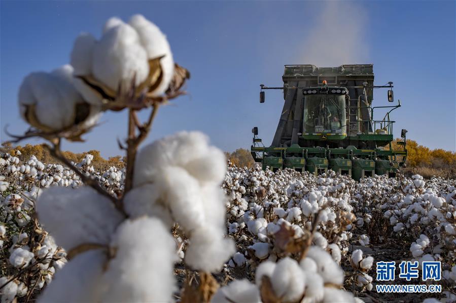 采棉机在新疆阿克苏地区沙雅县的一处棉田进行采收作业(10月23日摄)。新疆是我国棉花主产区。阿克苏地区沙雅县地处塔里木盆地西北缘,是产棉大县。又是一年秋收季,沙雅县棉花陆续采收,采棉机在棉田穿梭,轧花厂收购现场人来车往,一片繁忙场景。今年,沙雅县棉花种植面积达到198.43万亩,其中机采棉约150万亩,棉花机采率达到75%以上。 近年来,沙雅县先后吸引棉纺、农机制造、节水设备制造等多家企业落户,新型种植合作社、劳务服务合作社等也应运而生。新华社记者 胡虎虎 摄