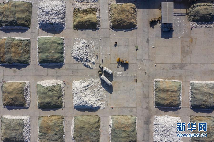 棉农在新疆阿克苏地区沙雅县塔里木乡的一家轧花厂交售棉花(10月23日摄,无人机照片)。 新华社记者 胡虎虎 摄