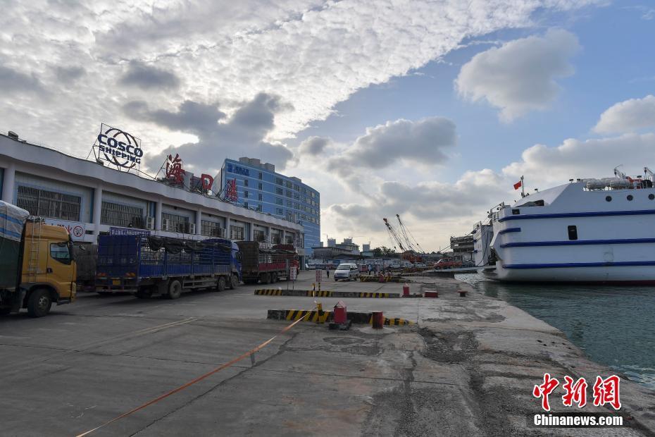 10月27日,众多货车在海口港码头排队,等待停航前最后一艘客滚船。受今年第18号台风“莫拉菲”和冷空气共同影响,当日夜间起琼州海峡风力将增大至阵风9-10级,所有客滚船于当日17时起全线停航。 中新社记者 骆云飞 摄
