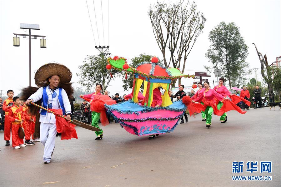 10月28日,在重庆市梁平区礼让镇,表演者在表演市级非遗项目“彩龙船”。 重庆市梁平区是中国民间文化艺术之乡,非遗文化底蕴浓厚,共有非物质文化遗产90项,其中包括梁山灯戏、梁平竹帘、梁平木版年画、梁平癞子锣鼓、梁平抬儿调等5项国家级非遗项目,以及礼让草把龙、梁平土法造纸技艺、铜乐锻造技艺等21项市级非遗项目。 新华社记者 唐奕 摄