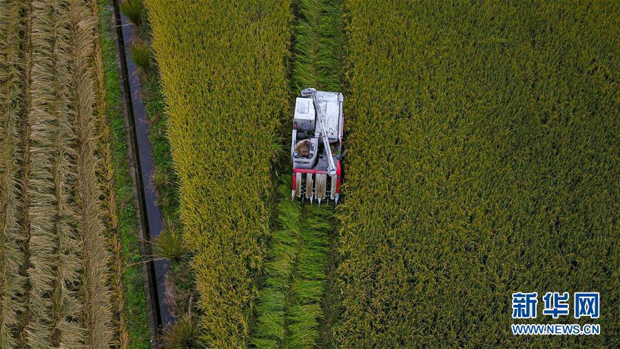 10月29日,收割机在杜黄新村的试验稻田中收割水稻(无人机照片)。 浙江省绍兴诸暨市枫桥镇杜黄新村是浙江省农科院水稻新品种培育实验基地,全村共有稻田2180亩,其中与浙江省农科院合作种植的试验稻田1100余亩。目前正值晚稻收割时节,已收割的试验稻田亩产达865余公斤,比非试验稻田亩产高出近35公斤。 新华社记者 沙达提 摄