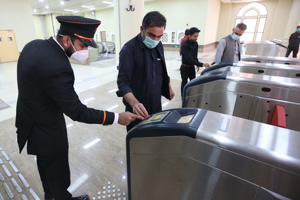 10月26日,在巴基斯坦拉合尔市,橙线地铁工作人员指导乘客如何使用检票闸机。