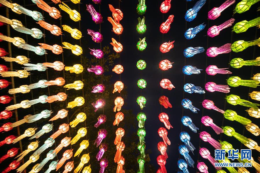 这是11月1日在泰国南奔府哈利奔猜寺拍摄的各色灯笼。 近日,泰国南奔府在哈利奔猜寺举办盛大灯会,十万盏灯笼将哈利奔猜寺点缀成了七彩缤纷的灯笼“海洋”。人们来到这里,将美好的祝愿写在灯笼上,并高高挂起,为新的一年祈福。 新华社记者 张可任 摄