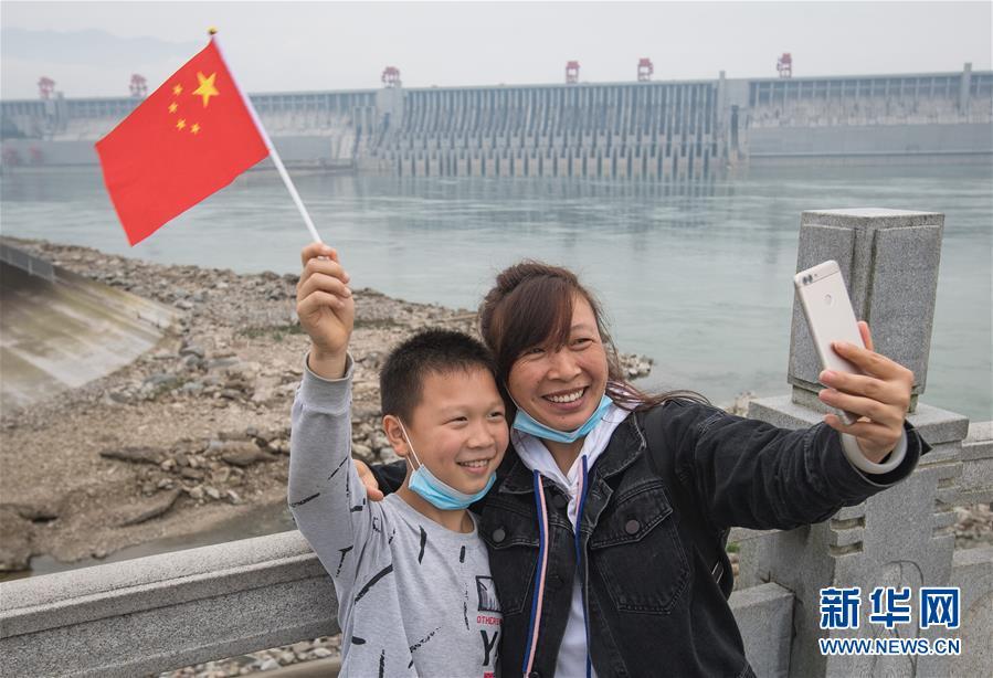 11月1日,游客在三峡大坝截流纪念园自拍。新华社记者 肖艺九 摄