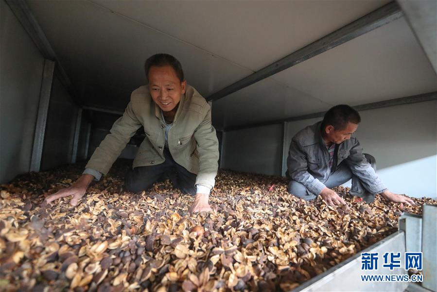 11月2日,在贵州省铜仁市玉屏侗族自治县一家油茶鲜果烘干厂,工人在油茶烘干车间劳作。 近年来,“中国油茶之乡”贵州省铜仁市玉屏侗族自治县把油茶产业列为脱贫攻坚的支柱产业之一,采取“公司+农户”的运营模式,吸收贫困户参与到油茶鲜果烘干各个环节做工,助力贫困户增收。 新华社发(胡攀学 摄)