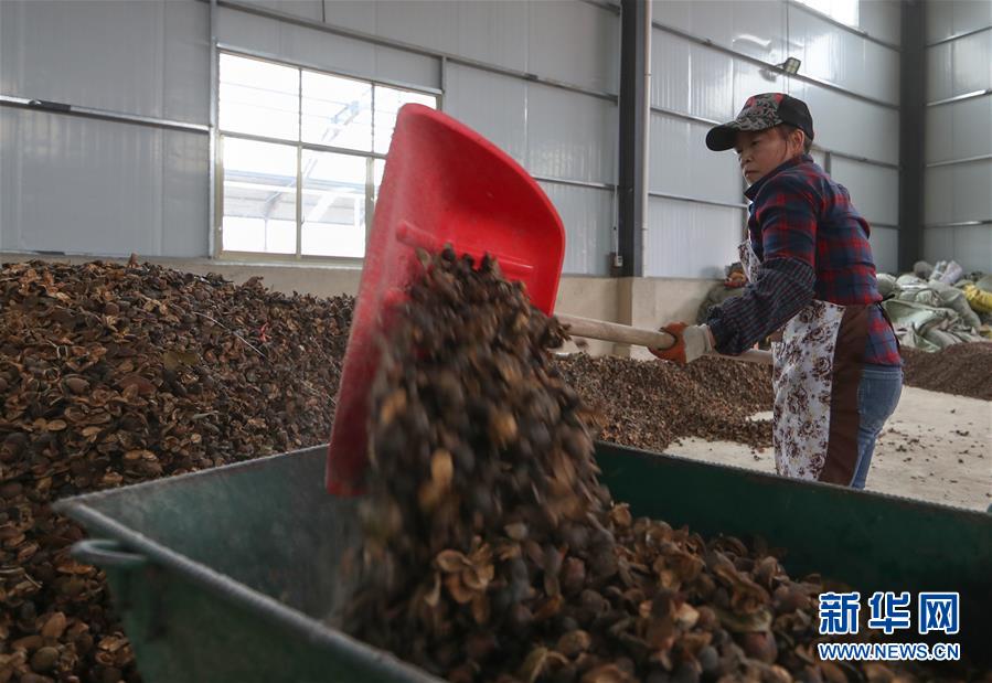 11月2日,在贵州省铜仁市玉屏侗族自治县一家油茶鲜果烘干厂,工人在铲油茶壳。 近年来,“中国油茶之乡”贵州省铜仁市玉屏侗族自治县把油茶产业列为脱贫攻坚的支柱产业之一,采取“公司+农户”的运营模式,吸收贫困户参与到油茶鲜果烘干各个环节做工,助力贫困户增收。 新华社发(胡攀学 摄)
