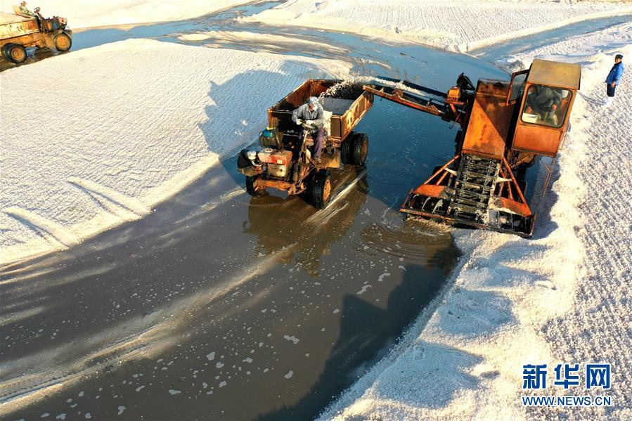 11月4日,青岛东风盐场的工人在结晶池收获海盐(无人机照片)。 时值海盐收获季,位于山东省青岛市城阳区的青岛东风盐场收盐工作全面展开,扒盐机械和收盐车辆在盐池中往来穿梭,收盐工人忙碌其间。 新华社发(梁孝鹏 摄)