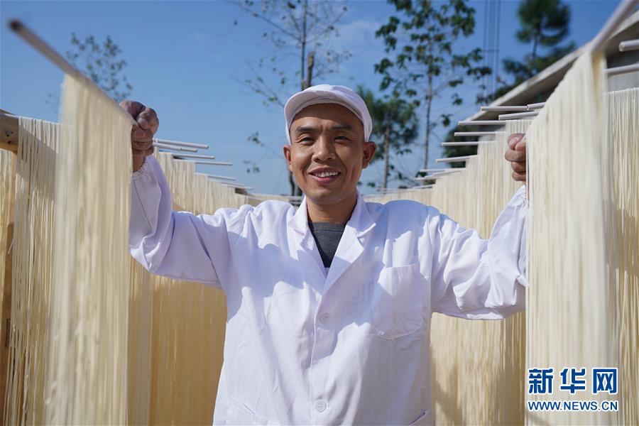 11月5日,周思彬展示自家生产的面条。 江西省万载县马步乡宝石村的周思彬,2013年因病辞职休养,失去了收入来源。2017年,他被列为建档立卡贫困户,并受益于政策报销了部分医疗费用。2020年,身体逐渐恢复的周思彬主动找到扶贫干部,希望经营面条加工生意。扶贫干部不仅帮他申请到了贷款,自己还解囊相借。半年过去,周思彬靠面条加工实现了两万元的盈利,还申请到了商标。下一步,周思彬准备开一家网店,把面条卖到网上去,把日子重新过红火。 新华社记者 周密 摄