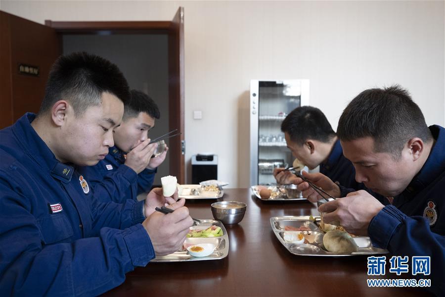 11月6日,在漠河市北极村消防救援站,消防员在食堂就餐。新华社发(张涛 摄)