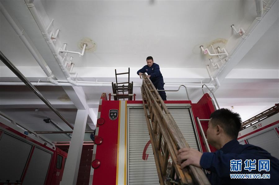 11月6日,在漠河市北极村消防救援站车库内,消防员拿出梯子准备训练。新华社发(张涛 摄)