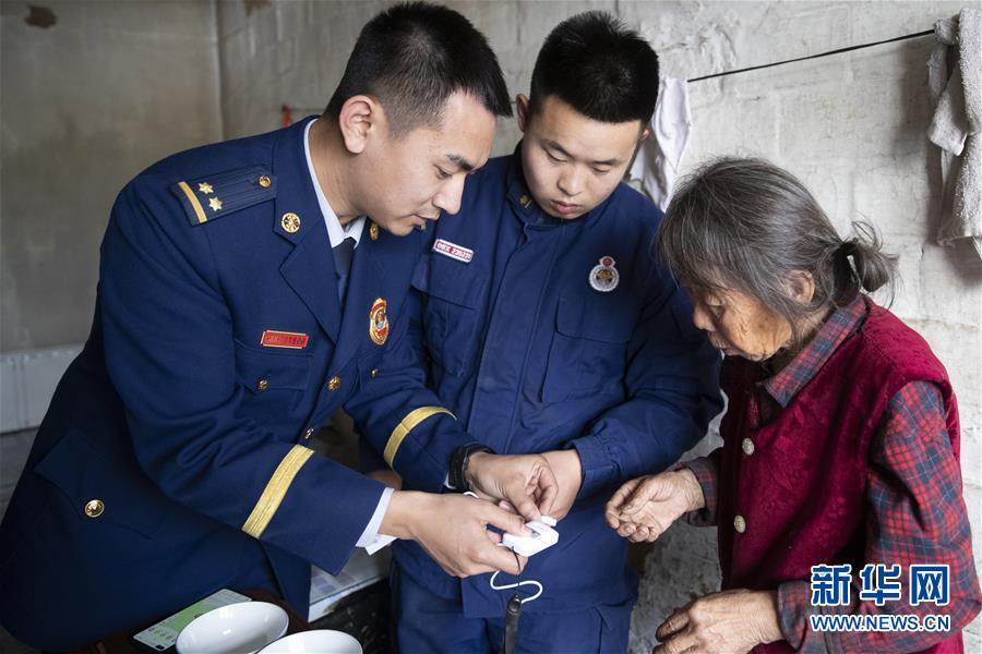 11月6日,北极村消防救援队的李函默(左一)和古誓言(左二)前往村民黄奶奶家送报警器。新华社发(张涛 摄)
