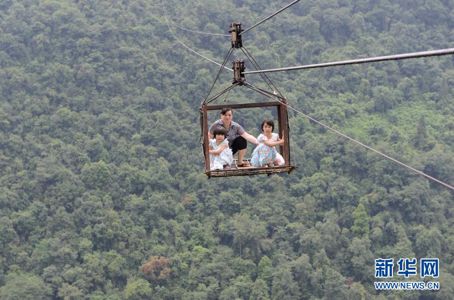 湖北省鹤峰县铁炉白族乡渔山村村民张凡英和两个孩子坐索道“铁篮子”回家(2013年7月23日摄)。新华社发(杨顺丕 摄)