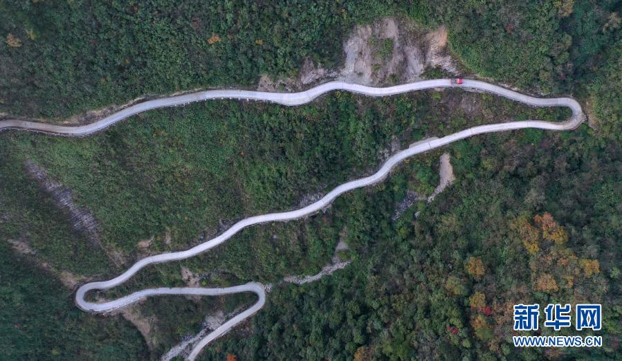 11月10日,车辆行驶在湖北省鹤峰县铁炉白族乡渔山村的公路上(无人机照片)。新华社发(杨顺丕 摄)
