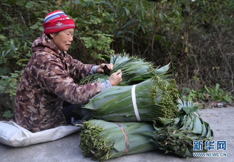 11月10日,湖北省鹤峰县铁炉白族乡渔山村村民向彩兰正在整理刚采下山的箬叶,准备出售。新华社发(杨顺丕 摄)