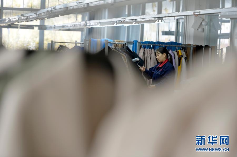 11月11日,清河县一家羊绒制品生产企业的员工整理羊绒大衣。新华社记者 牟宇 摄