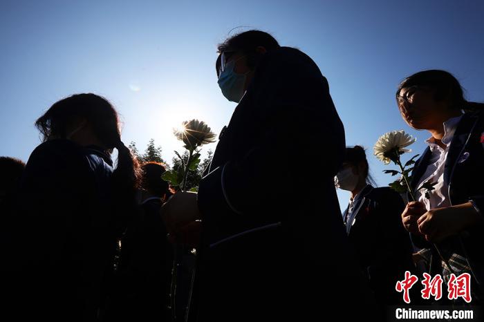 学生们手捧白菊向南京大屠杀死难同胞默哀,并敬献菊花。 泱波 摄