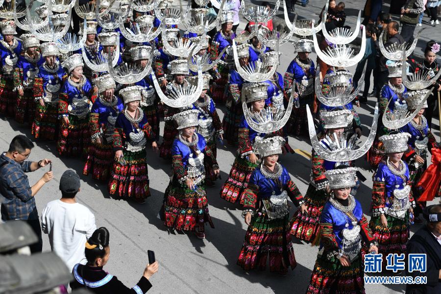 11月19日,身着盛装的苗族同胞参加巡游活动。