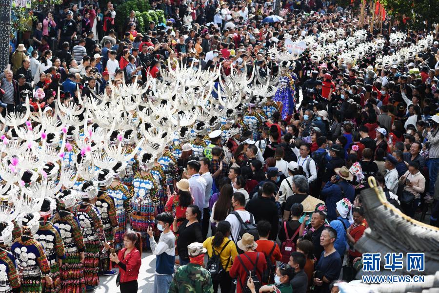 当日,贵州省黔东南苗族侗族自治州雷山县举行庆苗年活动。苗族同胞身着节日盛装载歌载舞,欢庆传统节日。“苗年”是苗族同胞集庆祝收获、祭祀祖先、感恩天地为一体的盛大节日。
