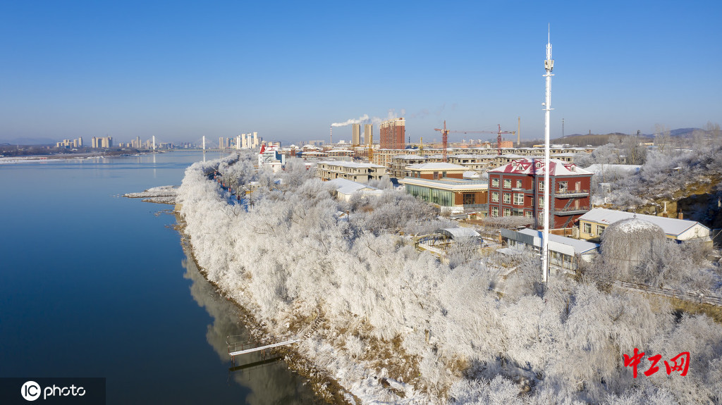 2020年11月23日报道,吉林省吉林市出现2020年冬季首场雾凇景观,大片雾凇晶莹团簇,冰晶挂上树枝,寒江雪柳,玉树琼花,松花江两岸“秒变”仙境。(朱大鹏/IC photo)