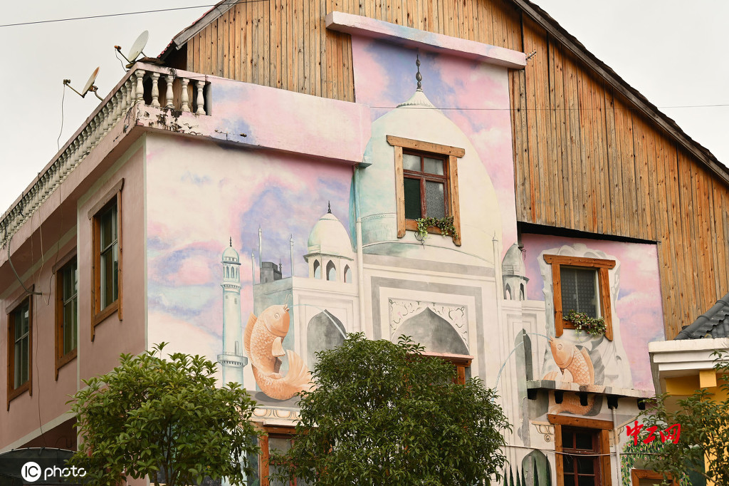 2020年11月24日,贵州省铜仁市,玉屏侗族自治县一村庄将房屋打造成创意涂鸦彩妆,似童话般的世界。当地村民的民房上到处都是别致创意大胆3D涂鸦艺术墙。一幅幅栩栩如生的3D画作极具视觉冲击力,极具疯狂视觉冲击力的涂鸦艺术受追捧,绿巨人、蜘蛛侠、钢铁侠等等创意别致的3D涂鸦吸睛。(胡雁/IC photo)