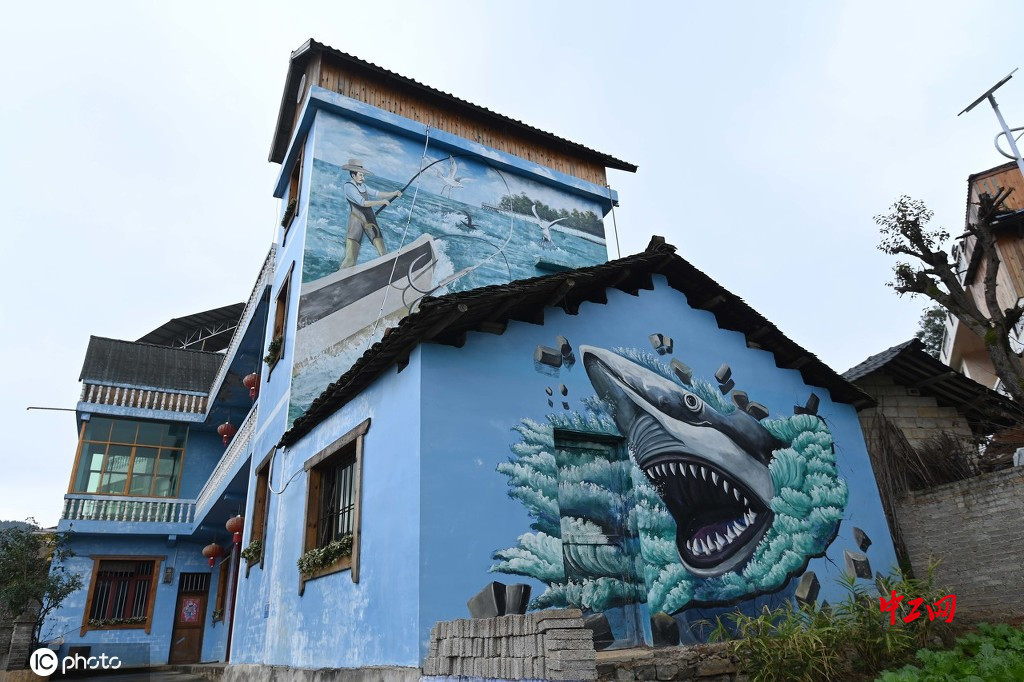 2020年11月24日,贵州省铜仁市,玉屏侗族自治县一村庄将房屋打造成创意涂鸦彩妆,似童话般的世界。当地村民的民房上到处都是别致创意大胆3D涂鸦艺术墙。一幅幅栩栩如生的3D画作极具视觉冲击力,极具疯狂视觉冲击力的涂鸦艺术受追捧,绿巨人、蜘蛛侠、钢铁侠等等创意别致的3D涂鸦吸睛。(胡雁/IC photo)