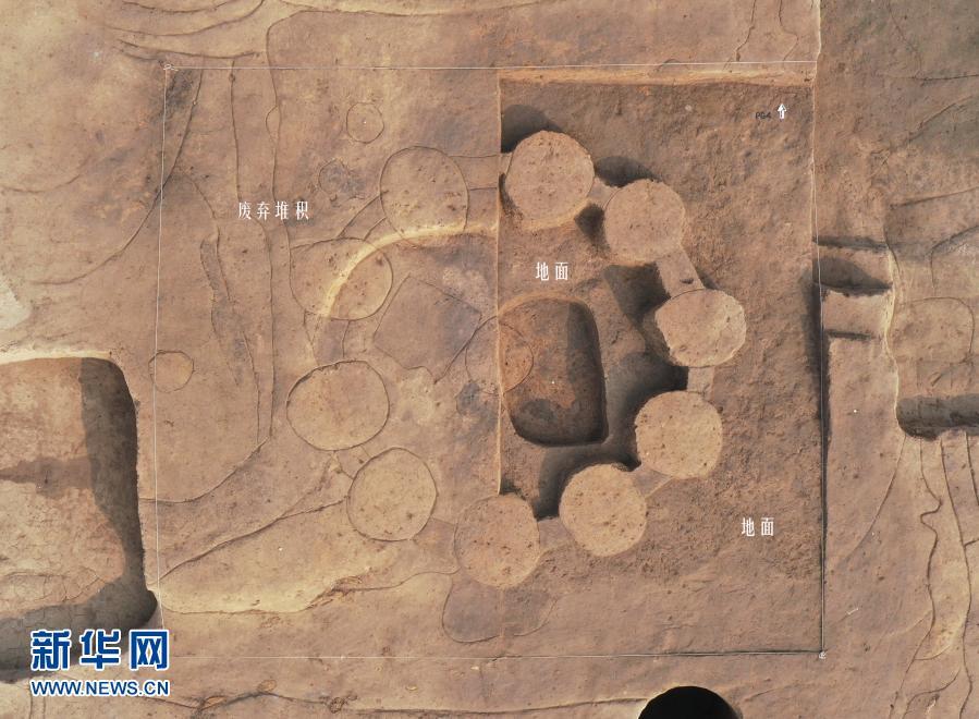 河南淮阳时庄遗址地上粮仓俯拍图(上为北,东半部解剖发掘至活动面)。新华社发(河南省文物考古研究院时庄遗址考古队供图)