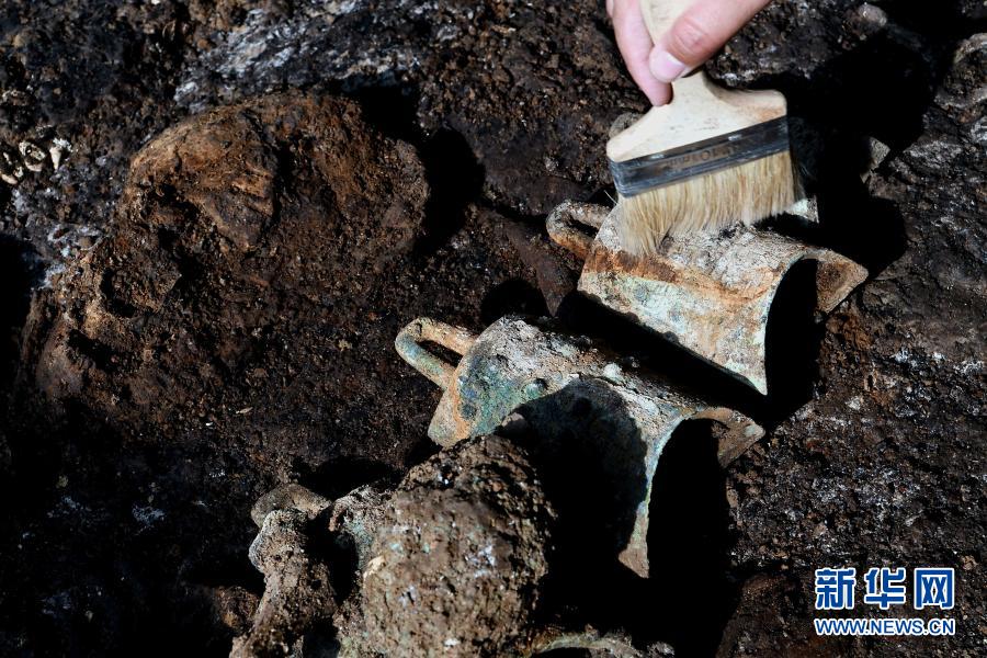 工作人员在清理河南洛阳徐阳墓地标号为M15的墓葬出土的编钟(11月27日摄)。