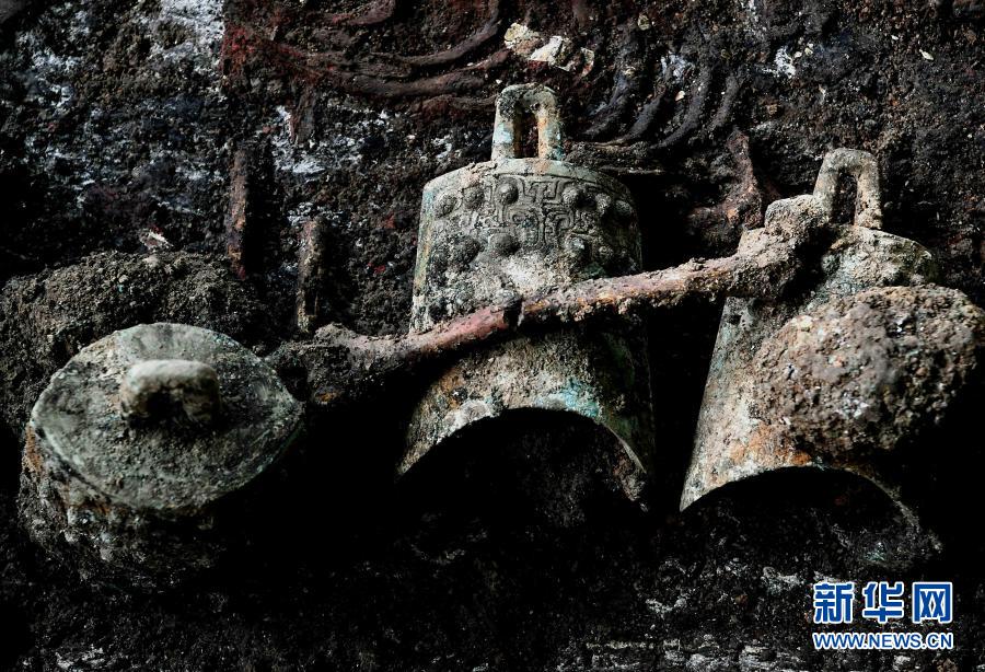 这是河南洛阳徐阳墓地标号为M15的墓葬出土的编钟(11月27日摄)。
