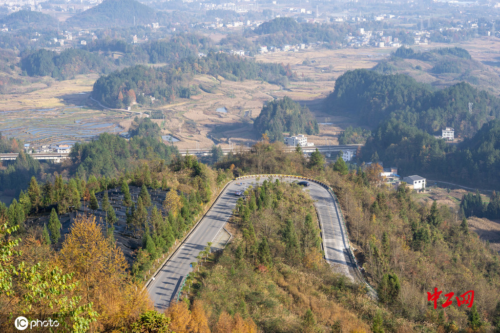 2020年11月9日清晨,车辆行驶在利川汪营盘山公路上,航拍利川盘山公路,壮美如画。(谢传辉/IC photo)