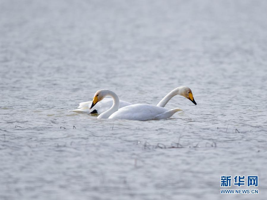 12月2日,在青海省海东市化隆回族自治县,天鹅在黄河上游弋。在青海省海东市化隆回族自治县,天鹅翔集黄河边,带来冬日里的勃勃生机。新华社记者 张龙 摄