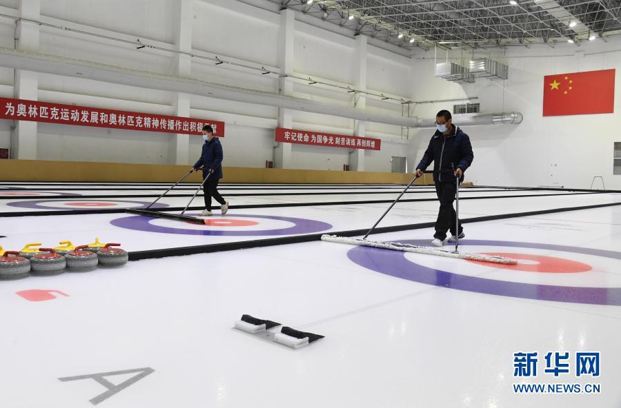 在位于北京市顺义区的国家残疾人冰上运动比赛训练馆轮椅冰壶训练馆,工作人员进行冰面清理作业(12月2日摄)。新华社记者 任超 摄