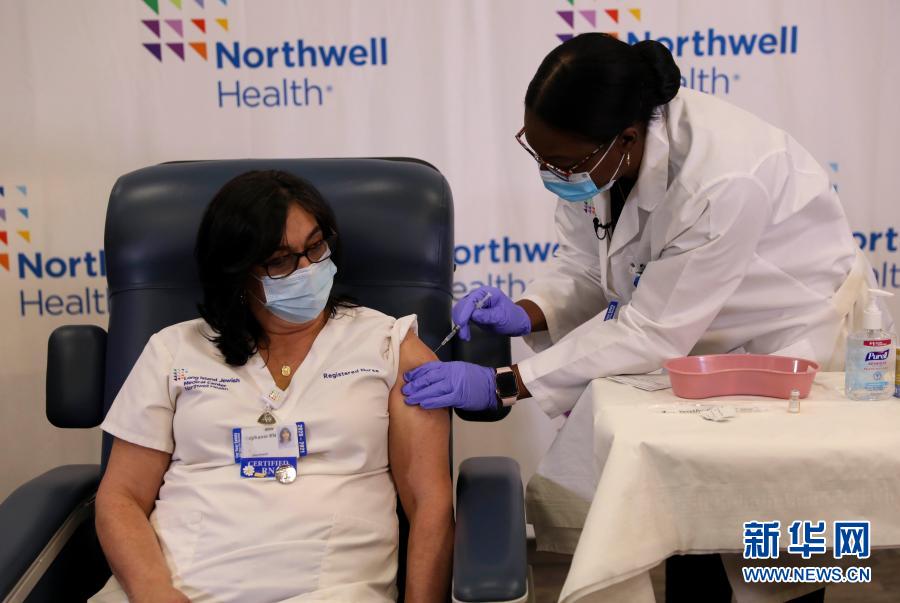 12月14日,在美国纽约长岛犹太医疗中心,护士斯蒂芬妮·凯尔(左)接种新冠疫苗。新华社记者王迎摄
