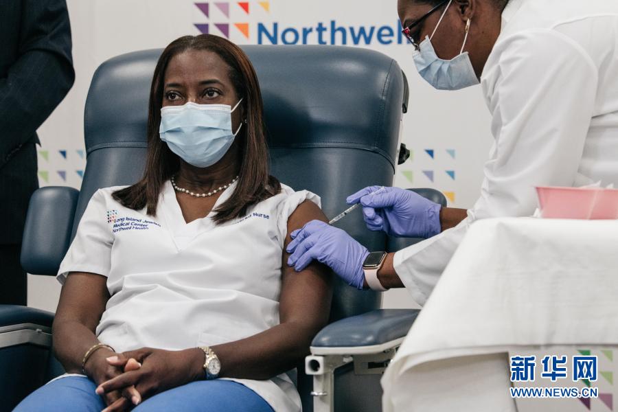 12月14日,在美国纽约,长岛犹太医疗中心重症监护室护士桑德拉·琳赛(左)接种新冠疫苗。新华社发(纽约州州长办公室供图)
