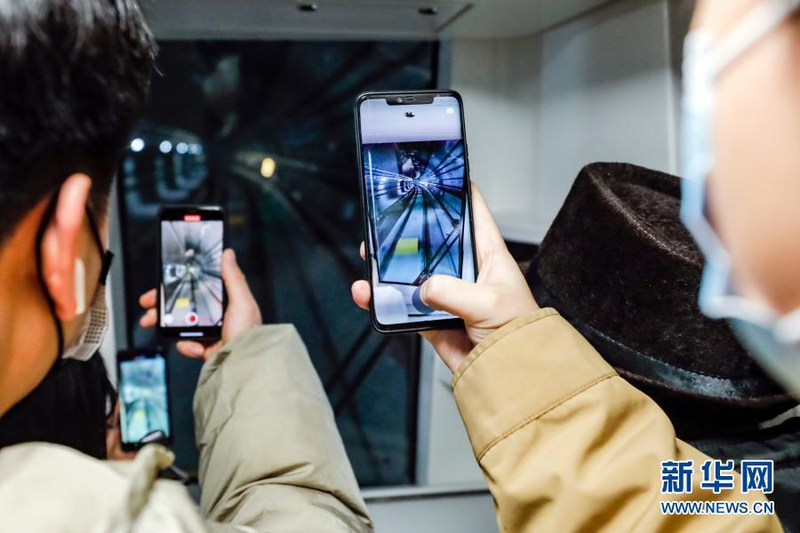 12月18日,在成都轨道交通9号线无人驾驶列车的“开放式”驾驶室,乘客用手机拍摄地铁线路内部情景。