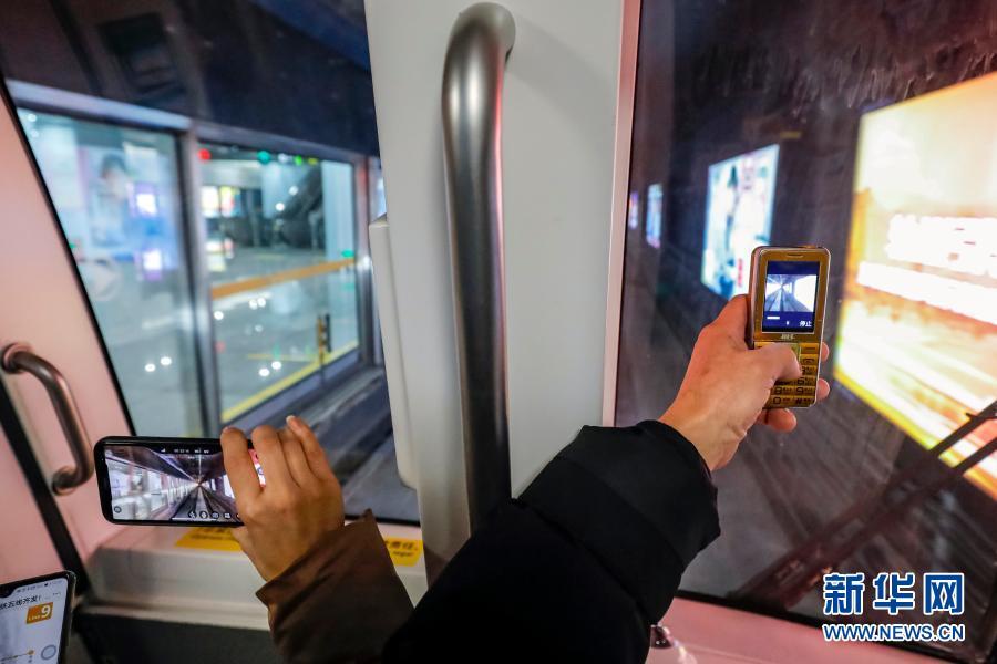 12月18日,在成都轨道交通9号线无人驾驶列车的“开放式”驾驶室,一名老者(右)用手机拍摄地铁线路内部情景。