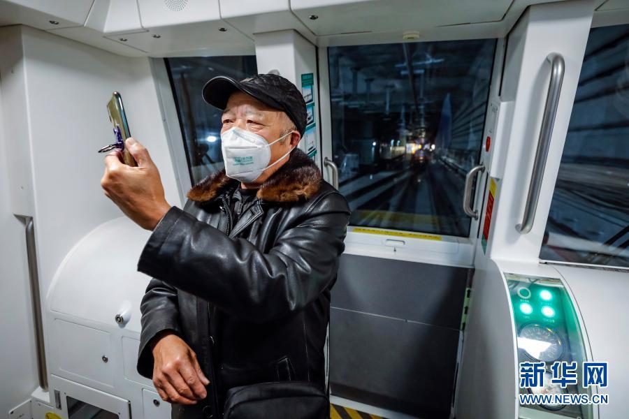 12月18日,在成都轨道交通9号线无人驾驶列车的“开放式”驾驶室,一名老者在自拍乘坐新地铁的情景。