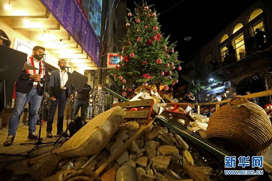 黎巴嫩:废墟前立起圣诞树缅怀逝者
