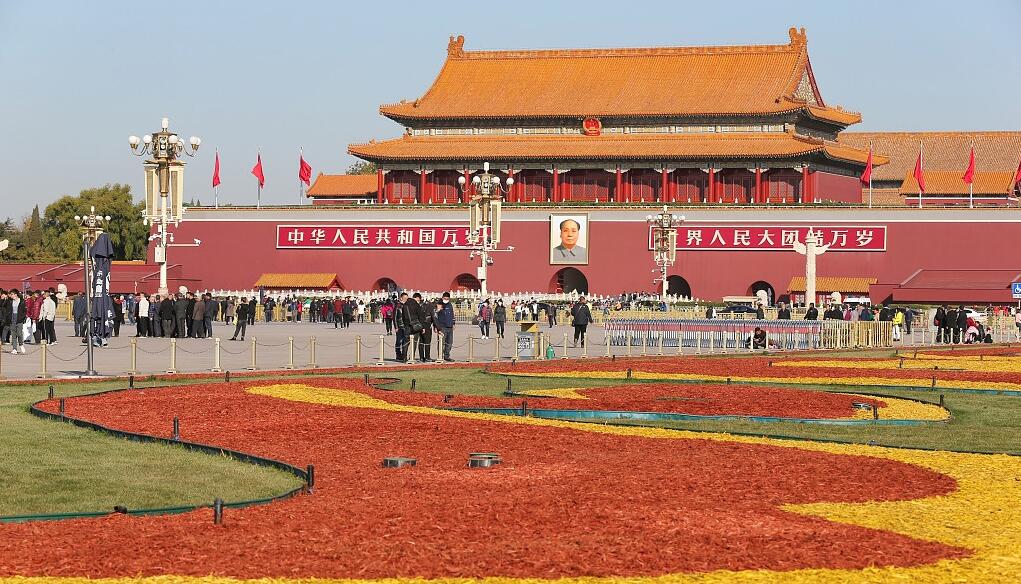 北京:天安门广场绿地首次“彩妆”过冬
