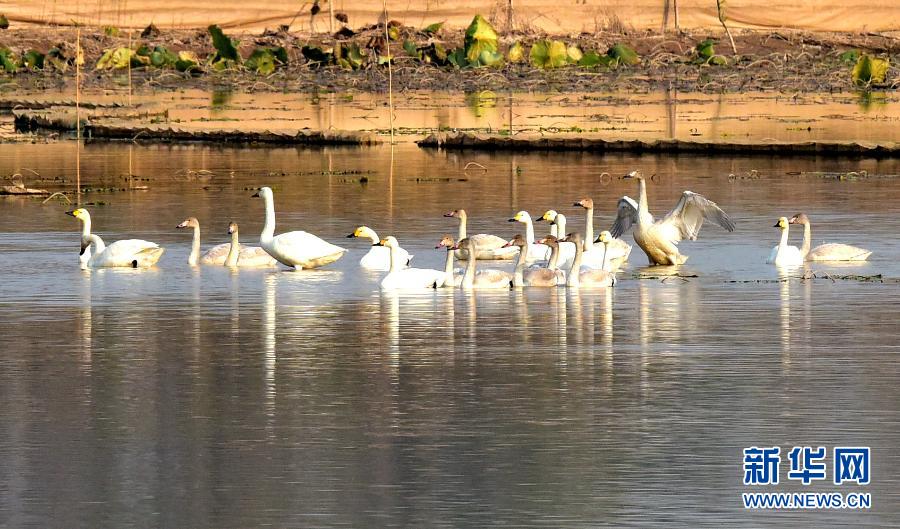 白天鹅在河南省商丘市民权县黄河故道国家湿地公园栖息(11月6日摄)。新华社记者 朱祥 摄