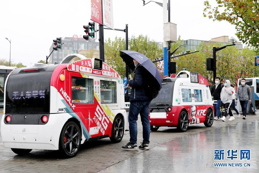 11月26日,无人餐车停靠在上海张江金科路地铁站外。近日,一种可以远程控制行驶并自主卖餐的移动无人餐车亮相上海张江科学城,为上班族提供快捷的用餐服务。无人餐车装备全方位感应雷达及摄像头,可实现远程操控并兼顾行驶安全。用户在车头前挥挥手,无人餐车就会停车。用户在车身购物屏幕上点选商品,扫描车身上方的二维码,支付取货一次完成。 新华社记者 方喆 摄