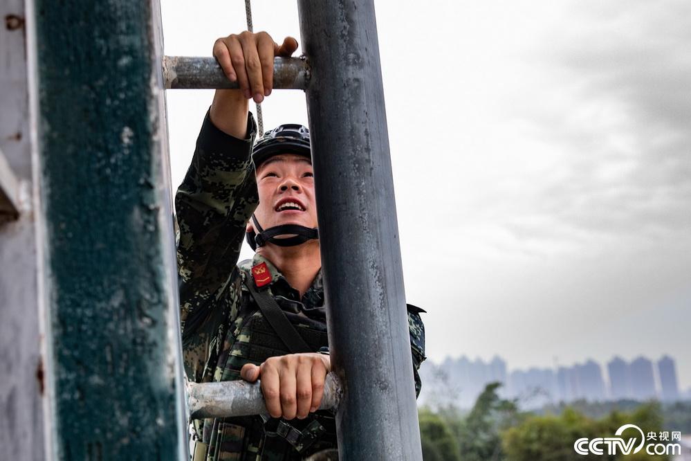 武警特战队员攀爬雨漏管。 柴浩摄影