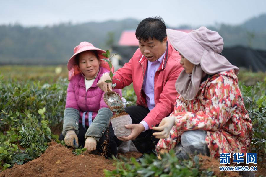 11月28日,在天柱县蓝田镇油茶苗改良基地,袁昌选(中)在指导村民培育油茶苗。新华社记者 杨楹 摄